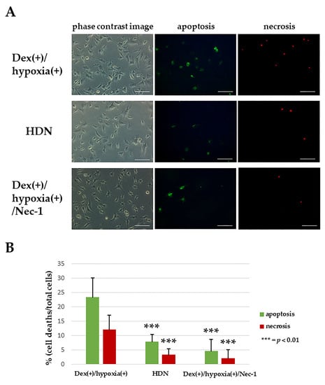 Cell death inhibition by necrostatin-1. (A) Immunofluorescent staining of apoptotic and necrotic cells using an Apoptotic/Necrotic Cells Detection Kit was performed as described in the Materials and Methods. (B) The graph indicates the percentages of apoptotic and necrotic cells in the indicated conditions. The numbers of apoptotic or necrotic cells were counted and related to the total number of cells. Columns and bars indicate means and S.D. respectively (n = 5). Relative to Dex(+)/hypoxia(+) group, Dex(+)/hypoxia(+)/Nec-1 group and HDN group showed significant decreases in both apoptotic and necrotic cell death (*** = p < 0.01 vs. Dex(+)/hypoxia(+) group). Scale bar: 100 µm.