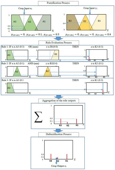 Figure 1 shows the steps for fuzzy inference system for two inputs (X and Y) and one output (Z). The degree to which the crisp input (x1 and y1) belongs to the appropriate fuzzy sets (A1, A2, and A3; B1, B2 and B3) is determined in the first step. In the second step, the fuzzified inputs are applied to the antecedents of the fuzzy rules (Rule 1, Rule 2, and Rule 3) to generate the rules output. Then, the unification of the outputs of all rules is implemented in the third step. Finally, the rules output is evaluated in output fuzzy sets to produce a crisp output z1 [31].