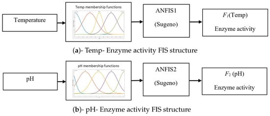 For the current -glucosidase modeling problem, discerning membership function parameters by inspecting data can be difficult. The input/output data will determine the membership function parameters rather than selecting the parameters via try and error or guessing. In this work, a neuro-fuzzy designer application in Matlab® is used to create a neuro-fuzzy inference system (ANFIS) based on input/output data. ANFIS can model a system with N inputs and one output when sufficient training data are available. Sufficient training data must describe the entire problem domain. In general, training data should accurately reflect the characteristics of the data that the FIS is expected to model [37]. For this study, however, the first set of training data was extracted from the pH-enzyme activity at one temperature setting (37 °C), while the second set was obtained from the temp–enzyme activity at only one setting pH value (5.5). Hence, the available initial data points do not fully describe the entire features of the MISO output system (pH–temperature–enzyme activity). Using an inadequate training data set can lead to insufficient training for the FIS and the inability to capture and infer the relation between system inputs and output. Therefore, a new procedure was implemented to satisfactorily utilize the multi-input single-output (MISO) process for the current study. The first stage uses ANFIS to generate a SISO model of the relation between pH and -glucosidase activity and temperature and -glucosidase activity independently. Then, the developed SISO models’ membership functions are used to generate the fuzzy inference system (FIS) for the MISO process in the second stage.