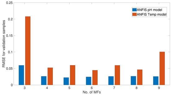 A SISO ANFIS model is developed based on the published Mathlab® code in Ref [40] to model pH–enzyme activity and temperature–enzyme activity individually, as shown in Figure 2a,b. Developing an effective and efficient ANFIS system requires adjusting and tuning the system parameters to obtain the best performance possible. The benchmark study Figure 3 served to provide an initial estimation for the necessary membership functions (MFs) required for each SISO FIS (5 MFs for pH and 6 MFs for temperature). Furthermore, the performance of the MISO system must be tuned carefully, and several trials might be needed to achieve the best results. After several iterations, the best results were achieved using 5 MFs for both pH and temperature in the MISO model.