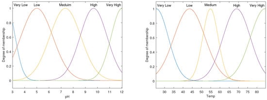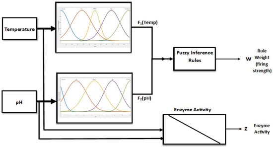 A new fuzzy inference system model needs to be developed to include more than one input variable simultaneously, as shown in Figure 5. The input memberships type and parameters were transferred from previously developed ANFIS models for each input variable (pH and temp).