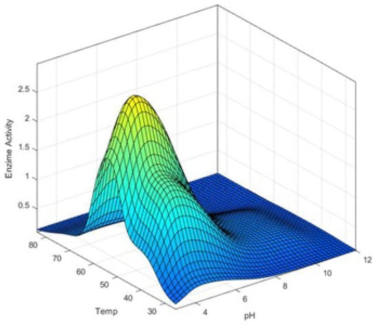 Optimum pH and temperature determination and improved control of kinetic parameters of -glucosidase is essential for the sustained use and economic viability of its biosynthetic processes. While we used pH and temperature as our parameters for modeling kinetic activity, it is certainly feasible to use other parameters, such as salt and substrate concentration in our modeling system. Therefore, future work will address other variables involved in -glucosidase kinetics, using the proposed modeling approach. The developed approach can be used to predict the reaction behaviors of several biosynthetic processes.