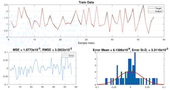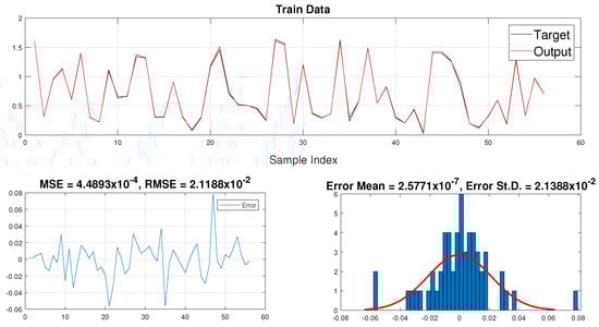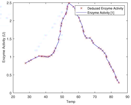 The developed fuzzy inference systems’ performance was evaluated against experimental (target) data, using different accuracy indicators. For the temp–enzyme activity model, the mean error for all data is 0.0044233, error STD is 0.038, and the RMSE is 0.0383, which means the developed FIS model successfully captured the relation between temperature and enzyme activity, as shown in Figure 9.
