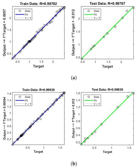 The ANFIS SISO model for the temp–enzyme activity is trained to capture the nonlinear relation between the reaction temperature and enzyme activity, as shown in Figure 7. The training goal was reached with a mean error of 6.13 × 10. The validity of the SISO temp–enzyme activity model and pH–enzyme activity model is tested, using a randomly selected new data sample (15% of the original data set). Figure 8 presents the regression model between the predicted and target values for the training and testing data sets. Both training and testing sessions display good performance with an R-value of more than 0.997 for training and testing data.
