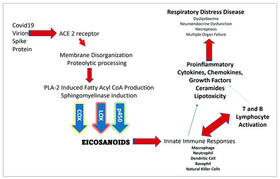 Another important element of lipid metabolic response to COVID-19 is intracellular signaling through long chain polyunsaturated fatty acid oxygenation. Twenty carbon and 22 carbon fatty acids (eicosanoic and docosanoic acids) are commonly linked to glycerol and sphingosine phospholipids in the plasma-membrane fraction of mammalian cells, including those of COVID-19 infected lung and serum leukocytes and lymphocytes [14]. Phospholipase A2 and fatty acid hydrolases can cleave these lipids to release free fatty acids, whereupon intracellular acyl-CoA synthetase re-esterifies them as coenzyme A-linked thioesters. C20/C22-CoA esters are substrates for cyclooxygenases, lipoxygenases, and P450 oxygenases to produce eicosanoids and docosanoids (local stress hormones often during active COVID-19 infection) [15].