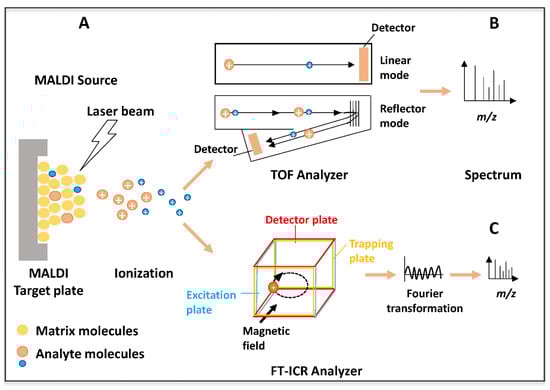 Schematics of the MALDI-MS preparation and the equipment used for SARS-CoV-2 detection. In the sample preparation step, analytes are mixed with a large excess of matrix and are spotted onto a stainless steel target plate, where they co-crystallize. In the MALDI source, (A) the co-crystals are irradiated with a laser beam, inducing the desorption and ionization of analytes. The generated ions are accelerated in an electric field, which directs them to the analyzer. In the TOF analyzer, (B) ions are separated according to their m/z in a flight tube by two different modes: linear and reflectron. The ions are accelerated toward a detector, which amplifies ion signals and converts them into a mass spectrum. In the FT-ICR analyzer, (C) the m/z are measured according to the cyclotron frequency of the ions, trapped in a circular orbit, and subjected to a magnetic field, subsequently generating a signal. Using a Fourier transform, the signal is converted into a mass spectrum. The MALDI mass spectrum represents the mass-to-charge ratios of each ionized molecular species in a sample.