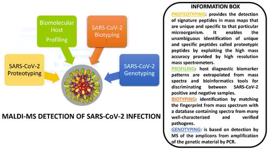 In this section, we report the MALDI-MS-based investigations which aimed to detect SARS-CoV-2 infection with the use of “proteotyping” [74], “biotyping” [69,70], “genotyping” [71,72,73], and biomolecular host profiling [75,76,77,78,79] approaches. Interestingly, two of these investigations used both biotyping and biomolecular host profiling strategies [69,70].