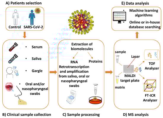 Workflow of main MALDI MS-based investigations targeting SARS-CoV-2. (A) Control subjects and (PCR-diagnosed) SARS-CoV-2 patient enrollment. (B) Clinical sample (serum, saliva, gargle, oral, and/or nasopharyngeal swab) collection from control subjects and SARS-CoV-2 patients. (C) Sample processing based on the extraction of RNA or proteins. RNAs are retro-transcripted and amplified from saliva, oral, and/or nasopharyngeal swabs in genotyping methods; proteins are extracted from body fluid samples or from cell-cultured SARS-CoV-2 samples in the proteotyping and biotyping methods; in the case of biomolecular host profiling methods, proteins are extracted from bodily fluids. (D) MS analysis based on the ionization in a MALDI source and the separation of the ions into two different types of analyzers: TOF and FT-ICR. (E) Data analysis using online or in-house database searching or machine learning algorithms for the detection of SARS-CoV-2 infection.
