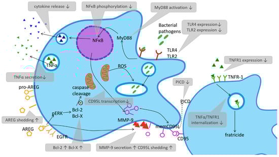 One molecular mechanism which may explain downregulated PICD in CBMOs is the balance of proteins belonging to the B-Cell lymphoma 2 (Bcl-2) family [33]. In comparison to PBMC, CBMC express higher levels of anti-apoptotic proteins whereas the expression of pro-apoptotic proteins is diminished [34]. Current findings identified amphiregulin (AREG) as an important player in this context. AREG is a growth factor that binds to the epidermal growth factor (EGF) receptor which can be found on the surface of monocytes and lymphocytes. Surface expression of membrane-anchored pro-AREG is increased on neonatal monocytes and cleavage/shedding of AREG was found to be highly elevated after infection with E. coli [34]. Infection induced higher phosphorylation of extracellular-signal regulated kinases (ERKs), higher expression of Bcl-2 and Bcl-XL and downregulation of cleaved caspase-3 and caspase-9 in an EGFR-dependent manner, thus inhibiting the intrinsic apoptosis pathway [34]. Data suggests that AREG shedding may cause apoptosis resistance and reduced PICD in neonatal monocytes via elevated intracellular MMP-2 and MMP-9 levels and FasL cleavage [34].