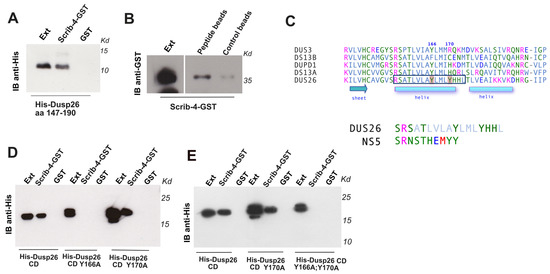 Since the deletion of the first 60 amino acids or of the carboxy-terminus did not affect its binding to Scribble, we investigated whether the binding region was enclosed in the catalytic domain of Dusp26. Interestingly, the region containing amino acids 147–190, which includes the AYLM motif conserved among several Dusp phosphatases, has sequence similarity with a Scrib-4 ligand contained in the TBEV NS5 protein (Figure 2C) [22]. The region was cloned in pET28 plasmid, and the peptide expression was verified via Western blot. In a pull-down assay, this region bound to Scribble PDZ-4, but not to the control (Figure 2A). To further verify this interaction, we used a biotinylated peptide with sequence SRSATLVLAYLMLYHHL (157–173) to affinity purify the Scrib-4. The peptide sequence reproduced the alpha helix 6 (157–173) of the phosphatase and was bound to streptavidin beads through the biotin residue. Although the peptide was partially insoluble, the percentage of PDZ-4 domain retained on the peptide beads was significantly more than that retained on the control beads (Figure 2B).