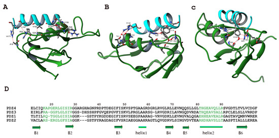 Ribbon diagrams of Dusp26–Scribble PDZ-4 structural models best ranked in HADDOCK analysis visualized with UCSF Chimera [29]. (A–C) Different orientations of the model are shown to highlight potential binding residues. Dusp26 peptide SRSATLVLAYLMLYHHL is colored in blue, while Scrib-4 is colored in green. Potential hydrogen bonds between atoms of the two proteins are indicated. (D) Multiple alignment of the four PDZ domains of Scribble according to Clustal Omega [31]. β strands are indicated with a green arrow and α helices are with a green bar. Residues that form the binding pocket for the ligand are colored in green. For clarity, the residues numbers refer to the crystal structure PDB 1UJU.