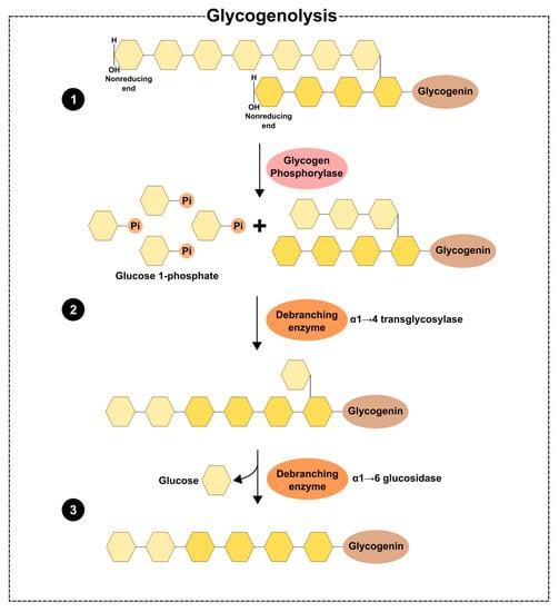 Cellular glycogen can be degraded in either lysosomes or the cytosol. Glycogen can be deposited inside the lysosomes, probably due to the action of autophagic vacuoles that encase a piece of cytoplasm and fuse with these organelles to process their content [37]. Glycogen is then hydrolysed by acid α-1,4-glucosidase (GAA), releasing glucose. GAA hydrolyses 1,4-linked α-glucose polymers first, but the mode by which the branch points are untied remains unclear. GAA needs to suffer post-translational processing to act in the degradation of glycogen. After the synthesis of a precursor polypeptide with seven glycosylation sites, allowing the attachment of carbohydrate chains to asparagine residues to form the N-linked glycosylation of GAA, the maturation of GAA occurs due to proteolytic processing in the amino and carboxyl terminus, which results in the formation of two GAA [38]. In the cytosol, glycogen degradation is catalysed by two enzymes—glycogen phosphorylase (PYG) and glycogen debranching enzyme (AGL). PYG catalyses the phosphorolysis of α-1,4-glycosidic bonds, releasing glucose-1-phosphate. This enzyme, however, only acts until four glucose residues remain in the branch before the α-1,6-branch point. Thus, the degradation of glycogen needs the action of AGL to surpass the branch points. This enzyme has two catalytic activities, α-1,4-glucanotransferase and amylo-α-1,6-glucosidase. The first one moves three of the four glucose from the lateral string to another linear strand, while the glucosidase hydrolyses the α-1-6-glycosidic bond of the branch point, releasing glucose and allowing the action of PYG in α-1,4 linkages (Figure 2) [39].