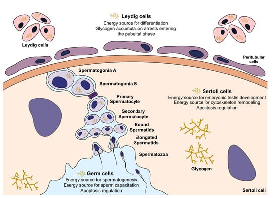 The testes have two important functions: the production of mature sperm (spermatogenesis) and the synthesis of steroid hormones (steroidogenesis). The action of Sertoli, Leydig, and germ cells must be coordinated to accomplish all these events. The metabolic cooperation established within these cells is fundamental to supporting the energy needs for spermatogenesis and steroidogenesis in the testis, although the particular role of glycogen in this event is far from being fully elucidated (Figure 3).
