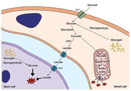 Lactate is a major energy substrate produced by SCs and is transported to germ cells through MCTs. MCT1 is expressed in all types of germ cells, while MCT2 was only detected in elongated spermatids of rats [123,124]. Spermatocytes and spermatids use preferentially lactate and not glucose to produce ATP, as it was observed that glucose induces the apoptosis of rat spermatocytes, while lactate could have a protective effect on spermatocytes [124]. Some specific glycolytic enzyme isoforms are predominantly expressed in spermatogenic cells [125], such as LDH-C, an isoform abundantly expressed in spermatids and spermatozoa [126,127], which was also detected in preleptotene spermatocytes [128]. Alterations in the Ldhc gene lead to a progressive decline in spermatozoon motility, incapacity to develop hyperactivated motility, and a decrease in ATP levels, resulting in male infertility [129]. Other specific isozymes that are only expressed in spermatogenesis are glyceraldehyde-3-phosphate dehydrogenase-S, which converts glyceraldehyde-3-phosphate to 1,3-diphosphoglycerate [130], and phosphoglycerate kinase-2, which is involved in the synthesis of pyruvate from glyceraldehyde-3-phosphate [131,132].