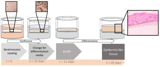 For the development of the cEpiderm, epidermal keratinocyte progenitor cells supplied by CELLnTEC (Bern, Switzerland) were used. The 3D keratinocyte Starter Protocol [15] was followed with some adaptations. Briefly, 2 × 106 cells were seeded in uncoated inserts (VWR Internacional, Carnaxide, Portugal), in DMEM (Sigma-Aldrich, Darmstadt, Germany) supplemented with 10% fetal bovine serum (FBS; Biowest, Nuaille, France), 5 ng/mL insulin (Sigma-Aldrich, Darmstadt, Germany) and 10 ng/mL epithelial growth factor (EGF; Sino Biological, Eschborn, Germany). The culture medium inside and outside the inserts was changed every 2–3 days until confluence was reached, which typically occurred 7–10 days after seeding. After the confirmation of the confluence, the culture media was changed, inside and outside the insert, for differentiation medium (CnT-PR-3D, CELLnTEC). The following day, the inserts were air-lifted to promote differentiation, and changing of the medium under the insert was carried out every 2–3 days until an epidermis-like tissue was obtained (see Figure 1).