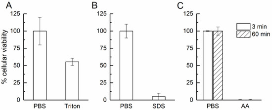 Cellular viability accessed in permeability (A), irritation (B), and corrosion (C) tests. PBS was used as control; Triton: 0.1% Triton X-100; SDS: 5% SDS; AA: acetic acid (glacial).
