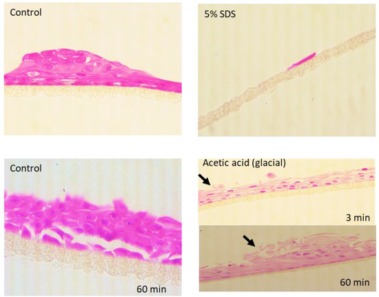 After a corrosion insult with acetic acid (glacial), the cell viability declined to 0% after 3 min of exposure, remaining at 0% after 60 min (Figure 3C). Histological evaluation has shown that the cell patches remain attached but show a progressive disruption of the tissue, characterized by a loss of integrity at the tissue surface (see arrows in Figure 4, lower panel).