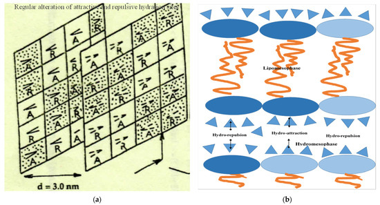Hydrophilic systems are characterized by their hydration layers on hydrophilic phase interface, denoted in the literature under various names, such as immobilized water, vicinal water, non-solute water, gel water, unfreezable hydration water, etc. Water in those hydration layers evokes weak hydration interaction between interacting opposite hydrophilic interfaces due to the interplay of long-range forces characterized by both the attractive and the repulsive hydration forces, i.e., bonding, and de-bonding activities, respectively [23] (pp. 222–241). The quality of these interactions is controlled by basic orientation of water molecules in interacting opposite domains of interfaces, i.e., the attractive or repulsive hydration forces are determined by inverse or identical aspects of this orientation, respectively.