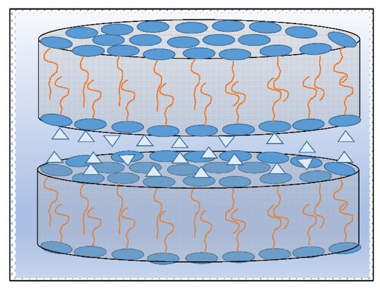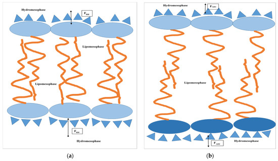 A similar real model represents bilayers created by amphiphilic molecules in a water environment in hydrotropic (lyotropic) liquid crystal systems (see Figure 2). For example, at the distance between interacting hydrophilic interfaces formed by molecules of an amphiphilic character, 2.8–3.2 nm, repulsion prevails among these interfaces at a temperature extent of 20–60 °C due to prevailing repulsive hydration forces in contrast with the adduction prevailing among those at 80 °C, followed by outstretching of those bilayers (compare Figure A1 and Figure 2b). Obviously, in contrast with a state in which the attractive hydration forces are prevailing, the prevailing repulsive hydration forces among interacting polar parts squeeze their bilayers (Figure 2a) during those interactions in hydrotropic liquid crystal systems. It is also important to mention that with increasing temperature, in comparable conditions, the repulsive hydration forces slightly decrease in contrast with the more intensive increase in the attractive hydration forces. Furthermore, with the decreasing distance among interacting lamellar interfaces, e.g., with decreasing water content in the system, the attraction hydration forces continuously increase in contradiction with the repulsive ones. At a certain distance, they reach a maximum which decreases with the increase in the temperature (see Figure A1).