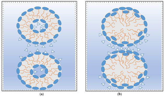 Temperature-sensitive microcapsules with walls consisting of PAH/PSS or PDADMAC/PSS bilayers irreversibly shrink upon heating from 4.5 to 1.3 μm with a concomitant increase in the shell thickness [52,53]. The results show a partial dehydration of the multilayers during the temperature-induced rearrangement. Additionally, the water content of the capsule walls is much higher than that of the same material prepared on planar interfaces (42–56% water). This indicates a more loosely packed structure in the capsule wall than at the planar substrate, and a strong effect of the solid substrate on the PEM structure [46]. In the case of strong polyelectrolytes, an influence of increased temperature is explained by the weakening of extrinsic charge compensation of polyionic polymers with counterions coming from added salt, followed by increasing intrinsic charge compensation due to electrostatic forces among interacting strong polyionoactive macromolecule pairs [50]. Similar behaviour of weak polyelectrolytes’ hydrophilic macromolecules, inclusive in the PEMs, is explainable only in terms of the increase in the hydration attraction among interacting nano-domains of macromolecules with an increase in temperature according to the abovementioned mechanism—see chapter “2.2. Temperature influence …” and also Figure A1 or Figure 8a (for the distance of interacting domains < 3 nm).