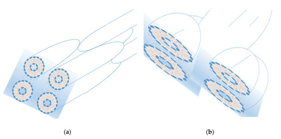 However, if the actual intermolecular forces (van der Waal’s respective London’s, Debye’s, or Keesom’s forces) among lipophilic parts of amphiphilic molecules are relatively high and protect the lipophilic chains of molecules to move mutually, a spatial reorientation of these ones is possible within a well-defined interlayer spacing of the hydromesophases. Another important aspect of this process is intermolecular distance fluctuation. Usually, due to intermolecular energy fluctuation, the distance between interacting forming bilayers is not constant. The interfaces then curl up due to differences in interactions between the hydration forces. The curling up of lamellar interfaces depends upon the difference of both the outer hydration forces relative to the surface area of a lamellar phase, ∆FH/A = ∆pH. Due to these forces, the lamellar originating structures form hexagonal, and planar–lamellar formations (Figure 3) as micro-rod space-oriented micro- and nanostructures of microspheres (i.e., micelles—see Figure 4a), and micro-disc structures (oval rod-like—see Figure 5a or oval disc-like—see Figure 5b) with different space architectures. These include discontinuous cubic, bicontinuous cubic, and helical chiral formations.