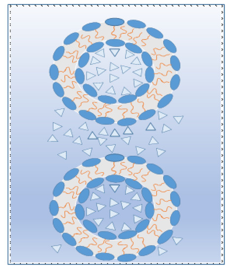 - If, in LCs systems, the attractive hydration forces (∆pH = (FAH1 − FAH2)/A > 0) prevail, then the outer interfaces have positive mean curvature (convex), i.e., normal micelle and normal discontinuous cubic, normal hexagonal, and normal bicontinuous cubic structures (critical packing parameter, CPP < 1) are forming. The inner interfaces of these objects have negative mean curvature (concave) with zero or a small amount of water in middle of the closed micro and submicro objects because, with a decrease in distance between interacting interfaces, the attraction between them is continuously increased (see Figure 4a). Obviously, this is caused by possible and favourable reorientation of the hydrophilic parts of amphiphilic molecules to the outer water medium (Figure 4b). Helical structures of cholesteric chiral smectic (soap-like) and nematic (thread-like) LCs are probably also formed by this intermolecular mechanism.