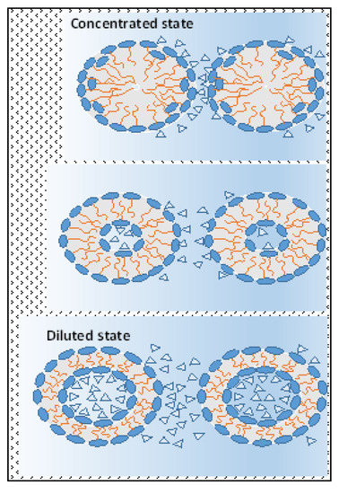 Schematic representation of formation of micellar, rod-like, or disc-like bilayers in dependence on water content in the hydrotropic system, i.e., by prevailing hydro-attraction (concentrated state) or hydro-repulsion (diluted state) among the polar part of amphiphilic interacting molecules. The symbols “∆” denote water molecule O < HH.