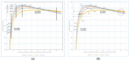 As follows from Figure 8a, behaviour of the high concentrated LCs systems should change more deeply. At the highest concentration of LCs, i.e., at interfaces distances < 2 nm, the consistency of those systems is increased with the temperature. In the range of the transitional concentrations, i.e., predominantly at distances of interacting interfaces in the range 2–4 nm, with increased temperature, the viscosity of LCs systems should be increased. Additionally, in contrast with lower concentrated LCs systems, the viscosity should decrease with increasing temperature (the prevailing repulsion hydration forces increase regularly with temperature only at interface distances > 16 nm). Furthermore, Figure 8b indicates more precisely at comparable conditions, i.e., at constant potential of the interactions, that prevailing repulsive hydration forces are less sensitive to consistency than the attractive ones (this one controls the distance between interacting outer and inner hydro-surfaces of LCs) of a hydro-system of mutually interacting micro-planes with mosaic organization of hydrated surfaces.