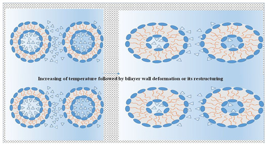The difference between hydration forces of the outer and the inner interfaces of interacting micro-objects formed by the bilayers evokes subsequent shape deformations of the cross-section from circular to elliptic form (see Figure 9). However, if the pressure of those hydration forces exceeds the acceptable level given by compactness of a bilayer wall, the micro-objects are squeezed or restructured into a reversed form of phases, i.e., the outer convex into the inner concave part and vice versa. It is important that the restructuring is accompanied by complete disintegration of the bilayer wall. Additionally, it is important that in both cases, the water solution closed in the inner parts of micro-objects is released into outer continuous hydromesophase. If squeezing has taken place only in contrast with mere deformation, the volume of closed water in the middle hollow part of the micro-object is decreased, e.g., from 13 to 10 zeptoL in sphere-shaped micro-objects with diameter, do = 10 nm, and the free water solution is released into the outer continuous hydromesophase. Contrariwise, a restructuring of the bilayer wall accompanies an increase in the temperature and an increase in the volume of closed water in the middle hollow part of the micro-object. In more detail, it is possible to study this restructuring process in Figure 10.