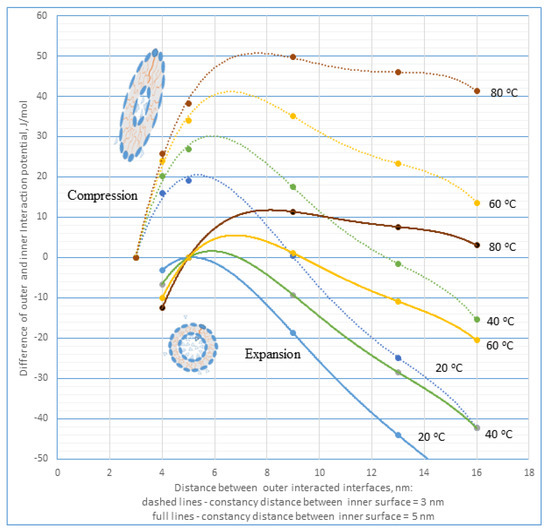 Figure 10 depicts theoretical dependences of the pressure of hydration forces upon the bilayer walls of interacting micro-objects vs. distance at the constant temperature of outer interacting interfaces relative to the constancy distance of inner interface do = 3 or 5 nm (see Appendix B). This pressure is possible to interpret as a difference between the outer and inner interaction potential of hydration forces during mutual interaction of two micro-planes with mosaic-type organization of the hydrated sites, influencing deformation of closed hydromesophase in micro-objects with bilayer walls. The theoretical calculations were derived according to data presented in Figure 8a. As follows, the pressure of hydration forces impacting closed inner hydromesophase in micro-objects with bilayer walls is dependent upon the distance between interacting interfaces in the outer hydromesophase, i.e., upon a concentration of those systems, and is strongly influenced by the temperature. An increased temperature intensifies this influence. This dependence is non-linear, with maximum at a given distance difference between outer and inner interacting interfaces shifting with increases in the temperature to greater values. For example, the spherical bilayer’s micro-objects with inner diameter do = 3 nm and concentration that enables us to achieve distances of their outer interfaces of d = 6 nm are restructured after reaching the temperature ≥ 40 °C. Thus, they reach a new equilibrium reverse state comprised of spherical micro-objects with diameter do = 5 nm, i.e., the inner part of the micro-object has increased its volume from 0.35 to 1.64 zeptoL.