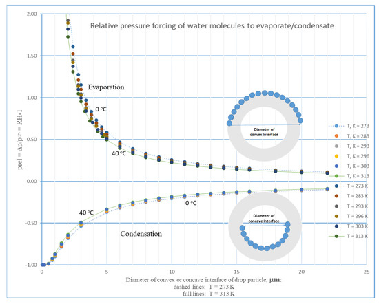 The relative pressure, prel forcing water molecules to evaporate (convex interface) or to condensate (concave interface) vs. diameter of the droplets, D (see Figure A2), at comparable temperature, is defined according to a well-known Kelvin’s relationship by use of the following equation: