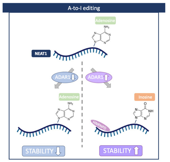 Nuclear-Enriched Abundant Transcript 1 (NEAT1) is a well-studied lncRNA that plays an essential role in cellular stress responses [70]. This lncRNA is frequently overexpressed in cancers, and its higher expression has been shown to correlate with decreased rates of survival in patients [71,72]. In addition, a recent study reported an increased level of NEAT1 in atherosclerotic cardiovascular disease [73]. Interestingly, in this case, NEAT stability was controlled by ADAR1 in an RNA-editing-dependent manner. Mechanistically, ADAR1 facilitated the binding of Heterogeneous Nuclear Ribonucleoprotein D (HNRNPD), which is required for NEAT1 stability (Figure 5) [73].