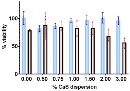 The percentage of live malignant (red) and benign fibroblasts (blue) as a function of the percentage (%) of CaS dispersion used.
