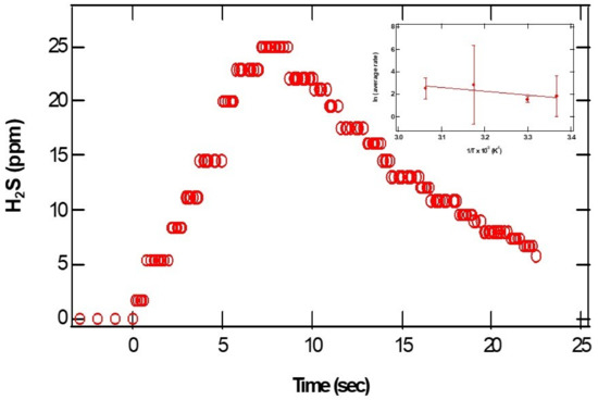 pH-dependent measurements of H2S from CaS: The dense dots in Figure 3 represent the parts per million of H2S gas detected at the exit of the reactor as a function of time. From the initial rise in the ppm of H2S, we estimated relative initial reaction rates. The insert represents a plot of the natural logarithm of initial reaction rates as a function of the reciprocal temperature. The error bars represent the standard deviations of at least three measurements at about the same temperature. Assuming a rate law of the form: