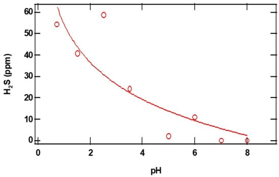 The open red circles in the figure represent the maximum amount of H2S detected (ppm) as a function of initial pH. The initial amount of CaS(s) employed is 0.01 mg. See text for details.