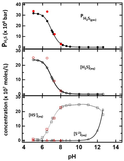 The distribution of sulfides in the gas and solution phases as a function of pH determined from minimization of the Gibbs free energy. The number of moles of sulfur is 2.5 × 10−6 moles for the indicated pH values. Values obtained from identical CaS amounts are indicated in red.