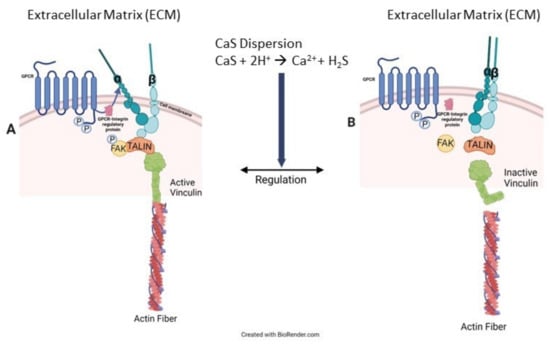Cancer cells usually overexpress FAK, as illustrated in (A) on the left-hand side of the figure. This overexpression results in the formation of active integrin–FAK–talin–vinculin–actin focal adhesion points (FAP). CaS dispersion increases inactive vinculin in the cytoplasmic fluid, as in (B), which is attributed to the appropriate regulation of FAK and, consequently, the FAP formation mechanism. Proper FAK function also facilitates the activation of cell death mechanisms.