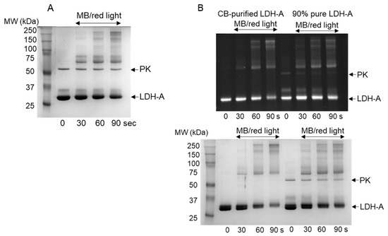 Recently, we reported that singlet oxygen (1O2) inhibited mammalian LDH-A activity and induced the formation of higher MW crosslinks observed by SDS-PAGE under reducing conditions [23]. The combination of a photosensitizer, methylene blue (MB) and red light under ambient oxygen was used to generate 1O2. Multiple higher MW crosslinks formed as the light exposure time increased. For the conditions employed in Figure 1A, a 90 s dose of red light resulted in complete inhibition of LDH-A activity.
