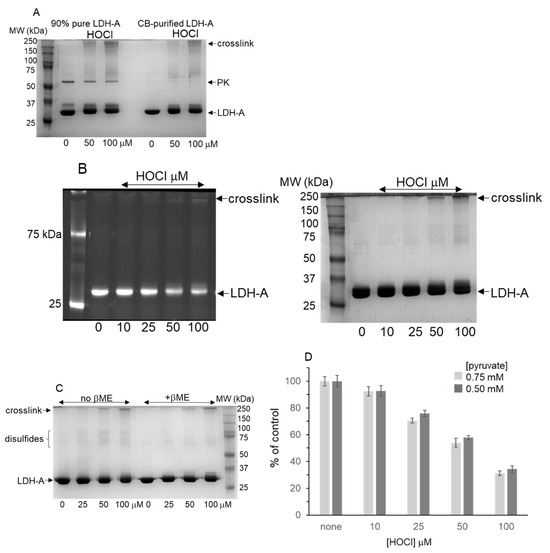 To examine the effect of a reducing agent on LDH-A mobility, control and HOCl-treated LDH-A were analyzed by SDS-PAGE with and without βME (no label). LDH-A was split into multiple bands by all three HOCl concentrations on the plus βME side (Figure 2C). In the absence of βME, the intensity of the LDH-A monomer decreased with increasing HOCl. Band splitting was not observed in the minus βME samples, but several faint bands were observed at sizes that were consistent with disulfide-linked dimers, trimers or tetramers.