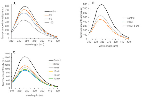 Tryptophan fluorescence is sensitive to the local microenvironment; therefore, it is useful for studying protein conformational changes. Rabbit muscle LDH-A contains six tryptophan residues that contribute to the overall fluorescence emission observed at 340–350 nm. The addition of increasing concentrations of HOCl resulted in a dose-dependent decrease in LDH-A tryptophan emission, but no shift in the emission maximum wavelength was observed (Figure 5A). Samples were treated with HOCl and scavengers in the same manner as for the kinetic and electrophoresis analyses in Figure 2, Figure 3 and Figure 4. Emission decreased with only 10 μM HOCl (1 equivalent relative to LDH-A concentration) (Supplemental Figure S6).