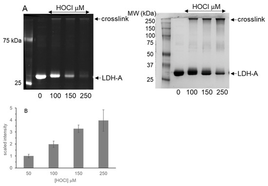 Figure 4A shows a dose-dependent decrease in LDH-A activity and a change in mobility following treatment with HOCl. The lowest dose of HOCl tested, 10 μM, did not result in a change in activity or mobility. LDH-A activity was detected in the sample wells for HOCl-treated LDH-A (Figure 4A). Given that the high MW crosslink was at the top of the SDS-PAGE separating gel, it was expected that it would have a different mobility and remain near the sample wells of the 0.8% agarose native gel. The crosslink retains activity because it contains reactive cysteines that could be labeled with M5F or IAF (Figure 2B and Figure 3A, Supplemental Figure S2). At 150 μM HOCl, any residual activity was only detected in the sample wells.
