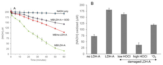 Lastly, the ability of LDH-A to enhance NADH oxidation, independent of pyruvate, was examined. Several research groups have reported that mammalian LDH-A enhances NADH oxidation following ROS exposure in vitro [25,26]. They determined that increased NADH oxidation by LDH-A involves a chain reaction propagated by superoxide anion (O2•−) that yields H2O2. Wu et al. demonstrated in HeLa cells that LDH enzymes were directly responsible for increased H2O2 production and overall oxidative stress [27]. Herein, we show that 1O2, but not HOCl, initiated NADH oxidation by LDH-A via intermediate O2•−. LDH-A oxidation by 1O2 or HOCl prior to initiation resulted in decreased capacity to perform this reaction.