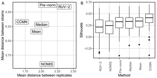 Evaluation of tightness of replicates before and after normalization with different methods. Performed on metabolomic dataset of different Pseudomonas aeruginosa clinical isolates, obtained from Santamaria et al. []. (A) Comparison of mean distance between replicates vs. mean distance across different clinical isolates after tested normalization methods. (B) Comparison of silhouette distributions. Both plots indicate that the CCMN method is the one that produces tighter replicates.