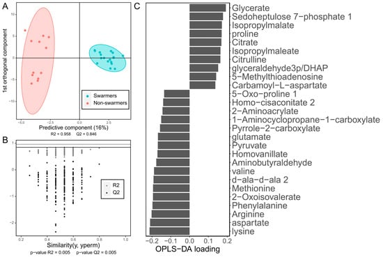 Plots obtained from an OPLS-DA model. The OPLS-DA model was fitted on the metabolomic dataset included in the study by Boyle et al. 2017 [], classifying the Pseudomonas aeruginosa clinical isolates as swarmers and non-swarmers (a collective motility phenotype P. aeruginosa displays). (A) Score plot of the predictive component and the first orthogonal component. Swarmers are indicated in blue, and non-swarmers in red. At the bottom of the plot, the R2 value of the predictive component and the Q2 obtained with cross validation are indicated. (B) Scatterplot of the R2 and Q2 values obtained with a permutation test (n = 200). Actual R2 values are indicated in gray, while Q2 values are indicated in black. The respective horizontal lines represent the actual R2 and Q2. At the bottom are the p-values of R2 and Q2, which are the proportion of permutated values that are higher or equal than the actual values. The similarity between the response variable value and the permutated response variable is represented in the x axis. (C) Bar plot of the loadings for the predictive component of the metabolites that were determined as statistically significant using the OPLS-DA model, with a variable importance in the projection (VIP) higher than or equal to 1. The metabolites with a negative loading are at a higher abundance in non-swarmers, while the ones with a positive value are at a higher abundance in swarmers.