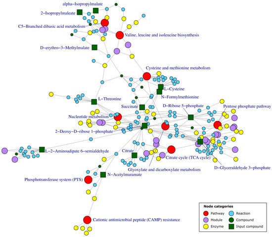 Example of pathway enrichment graph obtained using FELLA. The graph depicted here includes all the KEGG entries with a high probability of receiving a propagated signal from the differential metabolites, represented as green squares. The category of each KEGG entry is represented with a color. These results can be printed out as a table of p-values too. The red and the green square nodes represent the enriched pathways and the input differential compounds, respectively. The names of both categories are indicated in the labels. The enrichment depicted here was obtained using as input compounds the differential metabolites between a biosurfactant producer and non-producer strains from a study by Santamaria et al. [].