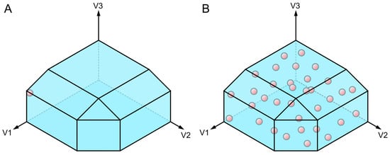 Graphical 3D representations of flux distribution obtention methods. The three axes represent the values of the three variables of a simplified model: the flux for each of the three reactions. The constraints that the model determines delimit the solution space, which is represented as the blue polyhedron. The red spheres represent feasible solutions of the solution space. (A) In flux balance analysis (FBA), the flux of an objective reaction is maximized; in this case, for V1, the solution is at the edge of the solution space where V1 is maximized. (B) In flux sampling, the solution space is randomly sampled a determined number of times. Therefore, each red sphere is a flux distribution sampled from the solution space.