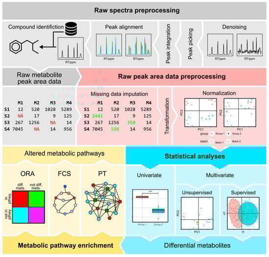 The bioinformatic analysis of metabolomic data can be divided into four main modules. The first module involves converting the raw spectra into metabolite feature data [,]. Metabolite feature data are tables of peak areas, where each row represents an analyzed sample, and each column, a metabolite. These peak areas are proportional to the relative abundance of the metabolite within the sample. To gain biological insight from the raw peak areas, several steps must be carried out, which can be grouped into the other three modules: peak area preprocessing, statistical analysis, and pathway enrichment. In the preprocessing module, missing values need to be imputed, and the unwanted experimental variability, removed. The statistical analysis module aims to identify associations between the biological factor of interest and the metabolite abundances. The final module, pathway enrichment, involves determining the metabolic pathways that appear to be perturbed across the biological factors of interest.