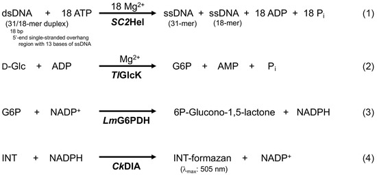 In order to determine the Z’ factor for the SC2Hel assay, there was an incubation time of 600 s, the assay was performed at room temperature, absorbance was monitored at 505 nm using a VANTAstar-F multimode microplate reader (BMG-Labtech), and all measurements were performed in septuplet. Furthermore, in a given assay reaction mixture for the positive controls, the following solution volumes and concentrations of reagents were added, as follows: (a) 55.7 µL of buffer A [50 mM TEA (pH 7.6), 150 mM NaCl], (b) 29.3 µL of 10 mM D-glucose, (c) 4.7 µL of 17 mM NADP+, (d) 9.4 µL of 124 mM MgCl2, (e) 9.4 µL of 10 mM INT in 100% DMSO, (f) 20.0 µL of 0.40 mg/mL SC2Hel in buffer A, (g) 0.94 µL of 1.0 mg/mL TlGlcK in buffer A, (h) 0.94 µL of 1.0 mg/mL LmG6PDH in buffer A, (i) 0.94 µL of 2.72 mg/mL diaphorase in buffer A, (j) 18.8 µL of 160.0 µM dsDNA (31/18-mer) in buffer A, and (k) 17.6 µL of 17 mM ATP. In the case of preparing a given reaction mixture for a negative control (also performed in septuplet), the following solution volumes and concentrations of reagents were added, as follows: (a) 94.4 µL of buffer A, (b) 29.3 µL of 10 mM D-glucose, (c) 4.7 µL of 17 mM NADP+, (d) 9.4 µL of 124 mM MgCl2, (e) 9.4 µL of 10 mM INT in 100% DMSO, (f) 0.94 µL of 1.0 mg/mL TlGlcK in buffer A, (g) 0.94 µL of 1.0 mg/mL LmG6PDH in buffer A, (h) 0.94 µL of 2.72 mg/mL diaphorase in buffer A, and (i) 17.6 µL of 17 mM ATP. Negative controls lacked both SC2Hel and dsDNA (31/18-mer) where the total volume was adjusted by adding buffer A. Exclusion of either component alone would also produce the exact same negative control result.