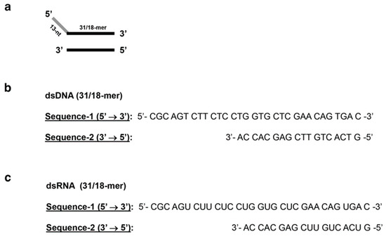 (a) Structure of a 5′ single-stranded overhang 31/18-mer duplex nucleic acid substrate of SC2Hel. The 31/18-mer substrate in the forms of either (b) dsDNA or (c) dsRNA.