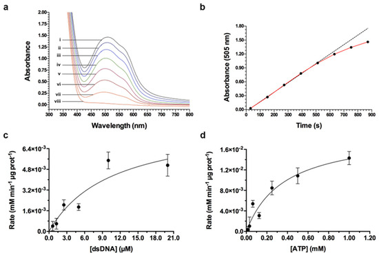 Kinetics of the SC2Hel/INT assay. The time optimum determination was assessed for the general assay response of SC2Hel in 50 mM TEA (pH 7.6), 150 mM NaCl at 22 °C. (a) The UV–visible absorption spectra are shown for the formation of INT-formazan (λmax = 505 nm) during a SC2Hel reaction kinetics experiment at various time points: (i) 872 s, (ii) 752 s, (iii) 632 s, (iv) 512 s, (v) 392 s, (vi) 272 s, (vii) 152 s, and (viii) 32 s. The substrate concentrations were as follows: [dsDNA] = 17.9 μM and [ATP] = 1.78 mM. (b) A plot of [INT-formazan] vs. time (red trace) is presented for the same kinetics experiment as in (a). The tangent line that was made from the first five time points (R2 = 0.9995) revealed a departure from the time trace plot and represented the linear regime of the reaction. The time optimum was determined to be 600 s. Michaelis–Menten plots of the SC2Hel/INT assay are shown for the formation rates of INT-formazan as a function of (c) [dsDNA] and (d) [ATP]. The mean and SD of three independent experiments are shown in both plots. The KM value for the 31/18-mer dsDNA substrate was determined to be 10.7 ± 4.7 μM with a VMAX value of 8.571 × 10−3 ± 1.938 × 10−3 mM min−1 μg prot−1. The KM value for ATP was determined to be 0.367 ± 0.120 mM with a VMAX value of 1.932 × 10−2 ± 2.872 × 10−3 mM min−1 μg prot−1. In panel (c), the assay used various concentrations of the 31/18-mer dsDNA substrate (range of 0.625–20.0 μM) and a constant concentration of ATP (2.00 mM). In panel (d), the assay used various concentrations of ATP (range of 0.0156–1.00 mM) and a constant concentration of 31/18-mer dsDNA substrate (72.0 μM). In all cases, the final assay concentration of SC2Hel was 1.3 × 10−8 mol/L, experiments were performed at 22 °C, and the reaction time was 10.0 min. Data analysis and plots were prepared in GraphPad Prism.